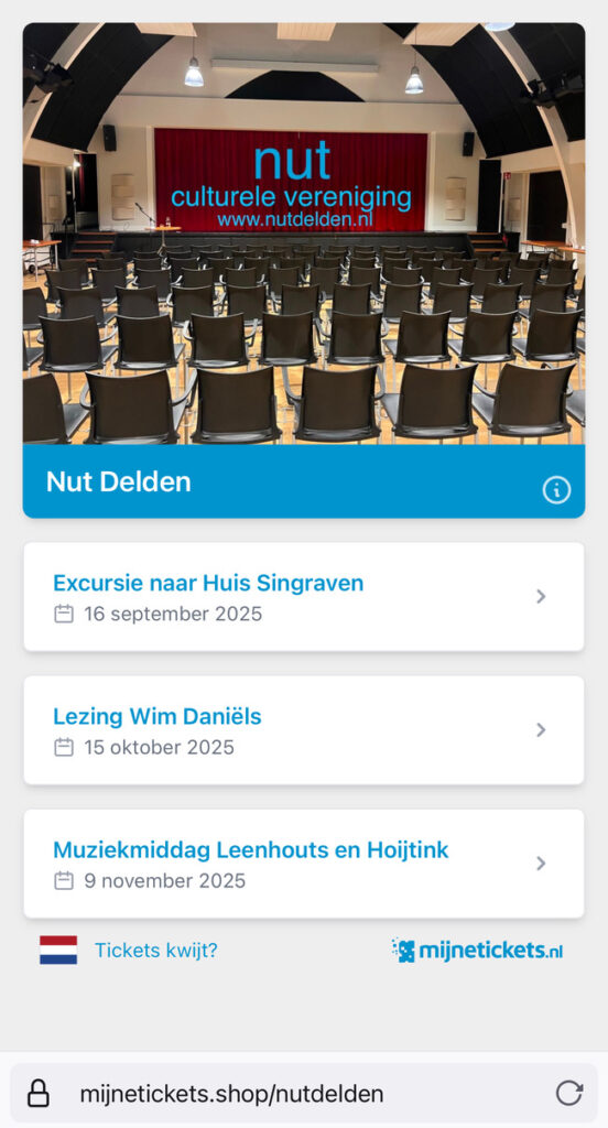 Vanaf augustus 2025 gebruikt Nut Delden een nieuw ticketingsysteem, dat Mijnetickets.nl heet. Het lijkt op ons vorige systeem, alleen heeft het nieuwe systeem meer mogelijkheden, werkt het (met QR-codes) sneller, en ziet het er aantrekkelijker uit. U ziet in onze ticketshop op https://mijnetickets.shop/nutdelden altijd de eerstvolgende activiteiten waarvoor u tickets kunt bestellen.