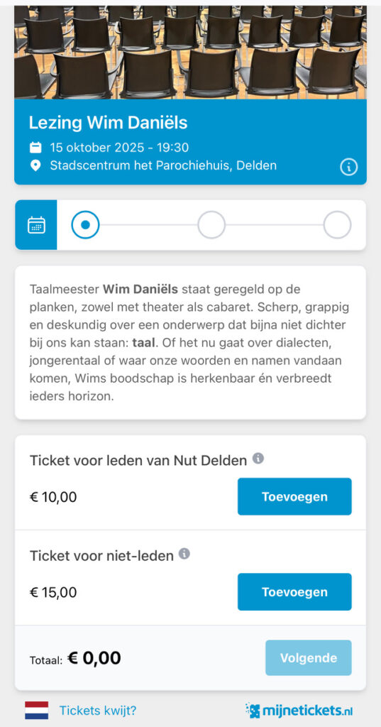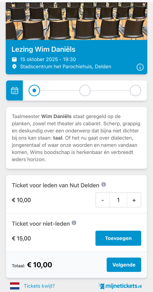 U ziet nu het cijfer 1 in dit voorbeeld achter de keuze “Ticket voor leden van Nut Delden”. Klik eventueel op de plus (+) naast het cijfer 1 om nog een tweede ticket te bestellen voor een medelid.