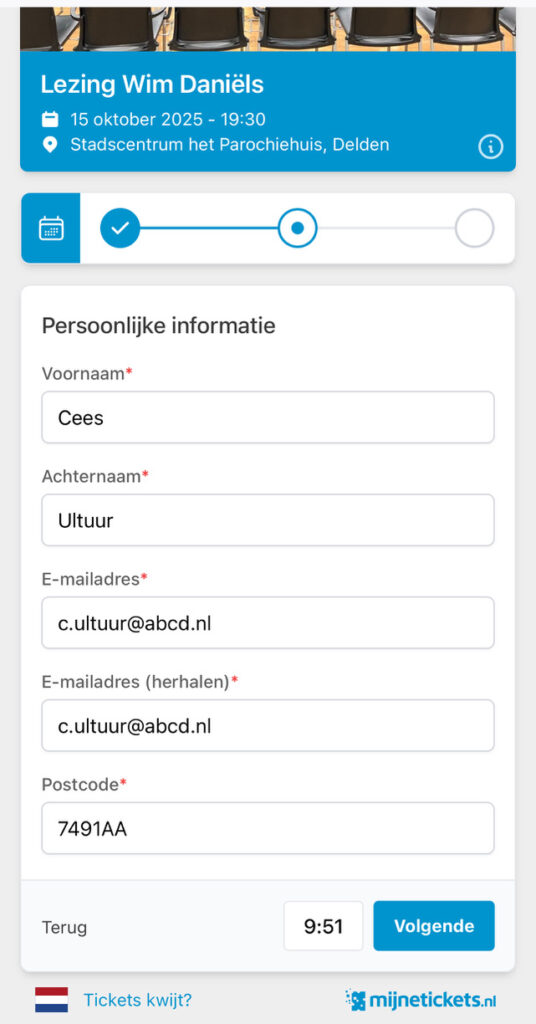 Vul de gevraagde Persoonlijke informatie in om te zorgen dat het ticket op uw naam wordt gezet en in uw persoonlijke mailbox terechtkomt.